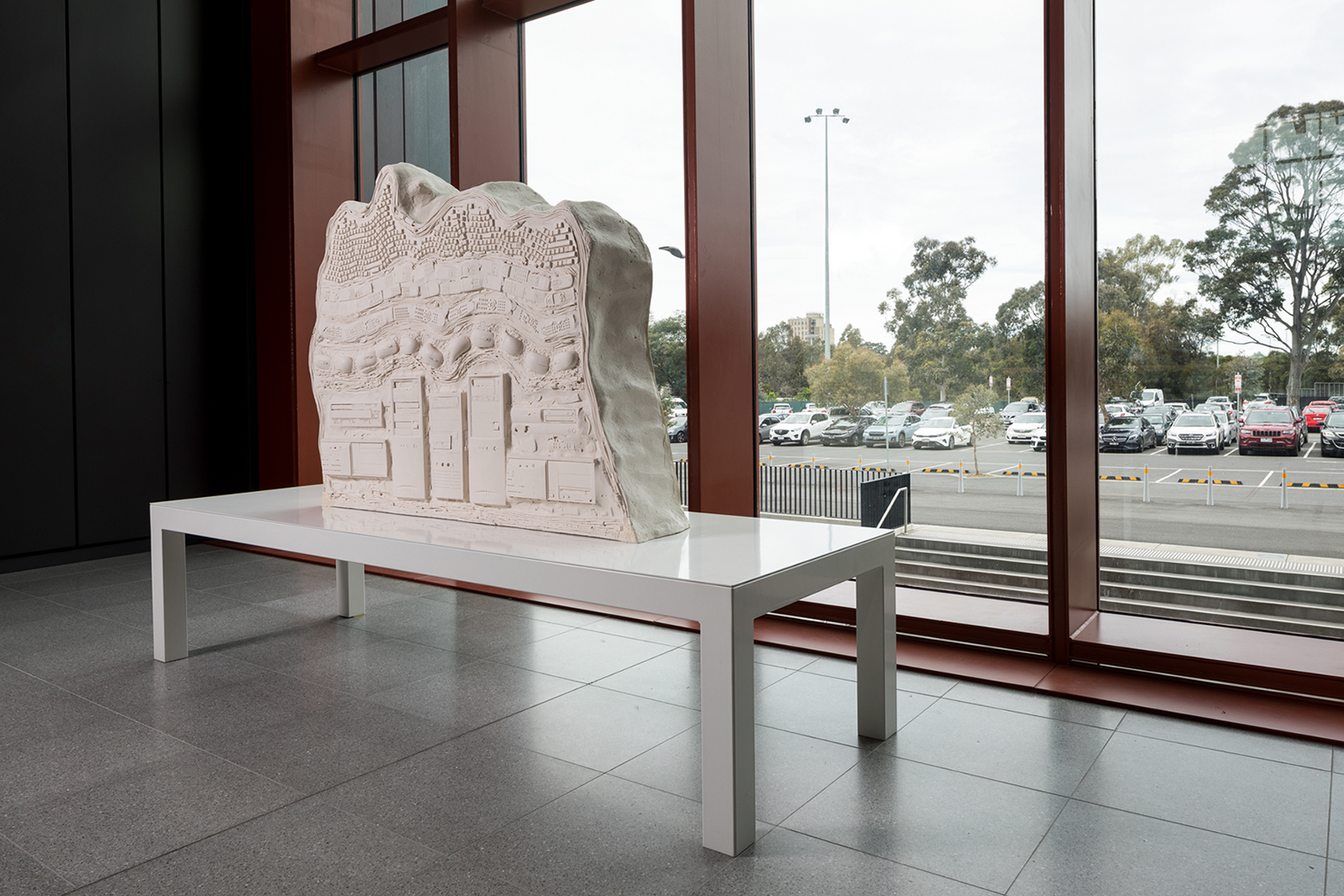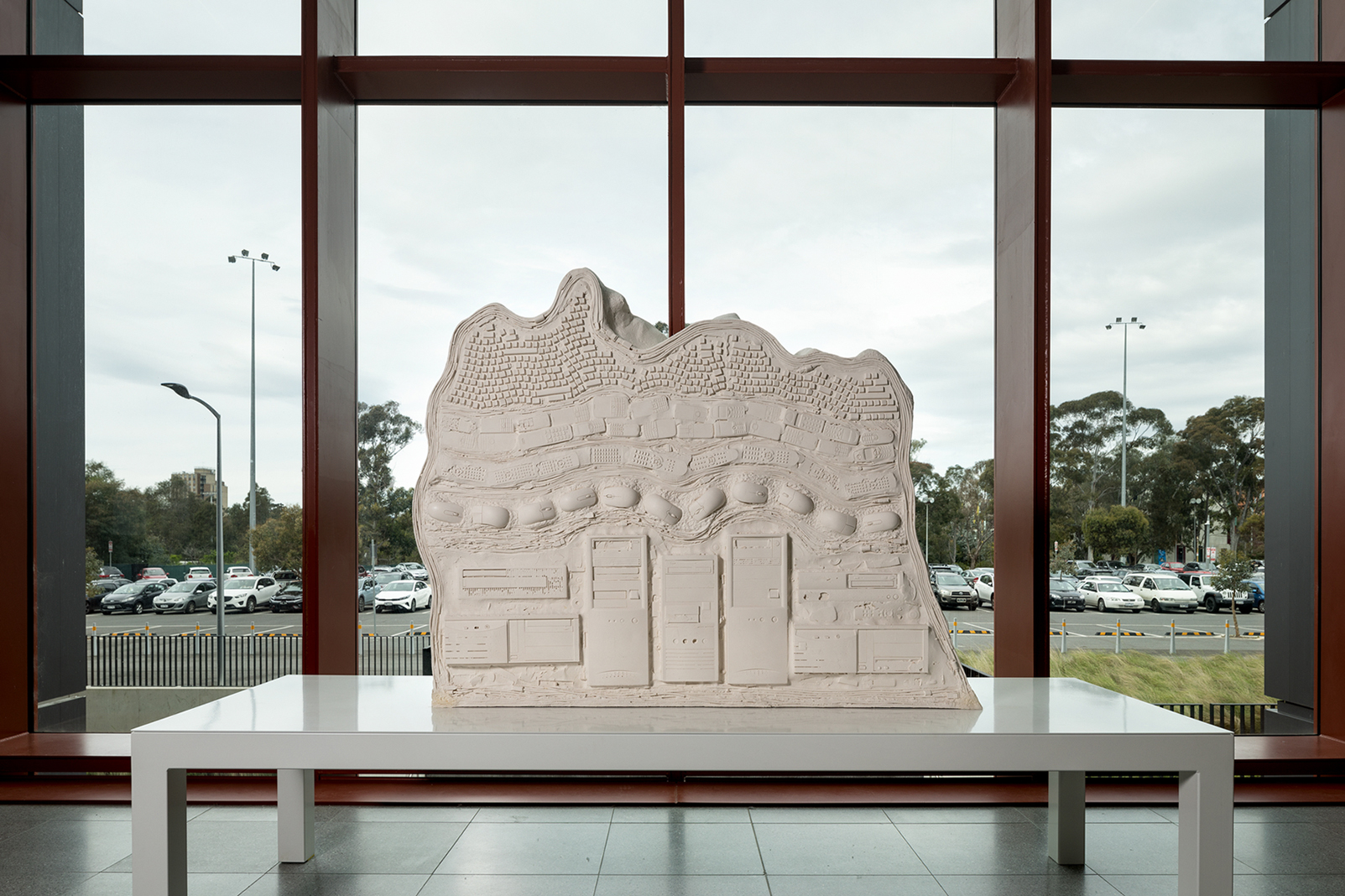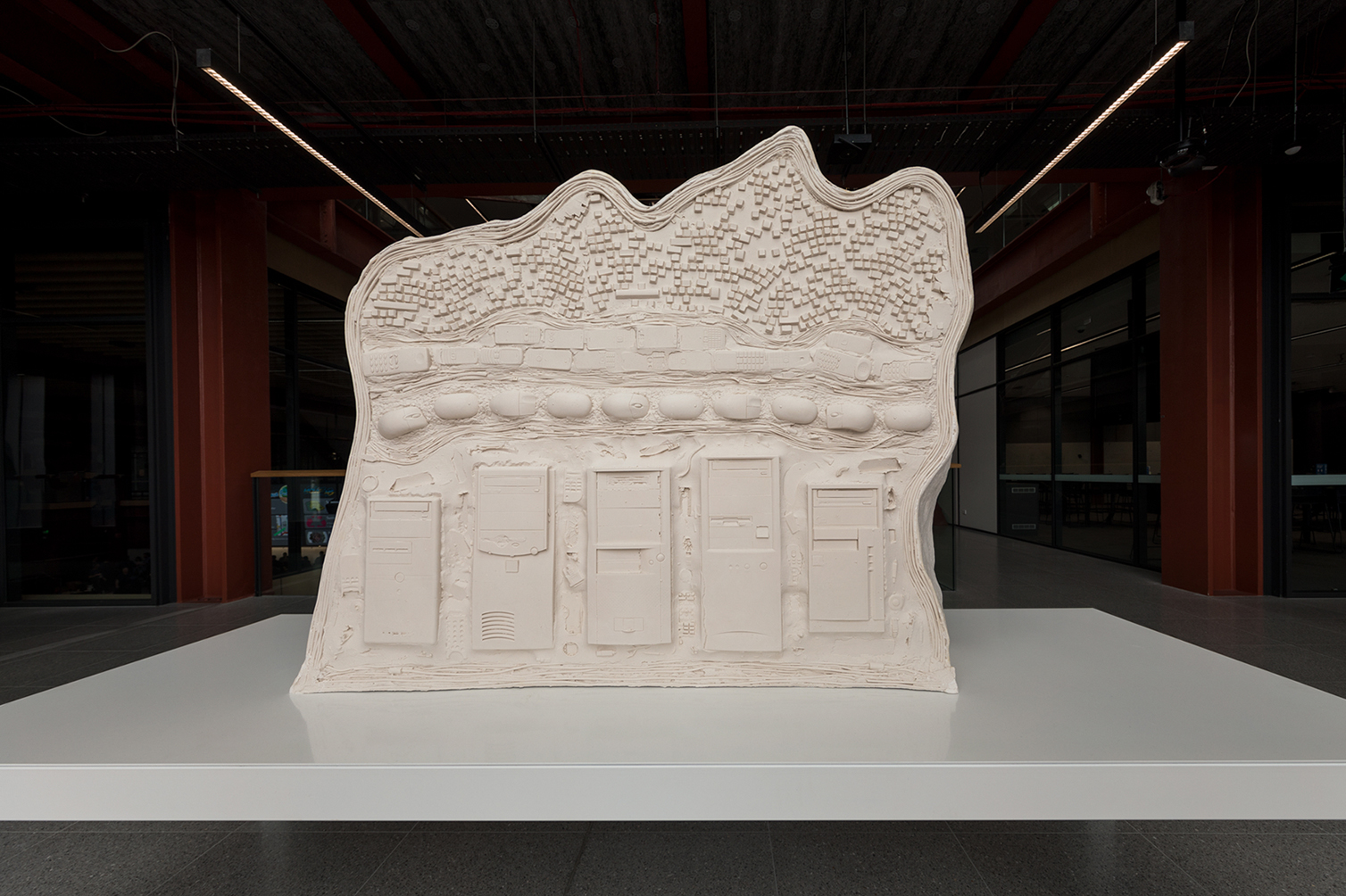 The sculpture draws on scientific representations of the natural world, with reference to geology, palaeontology, and also archaeology. One such mode is the cross-sectional diagram, where matter is sliced away from a surface, to show the accumulation of layers over time. The traditional sculptural languages of casting and sculptural relief, along with newer techniques of digital scanning and fabrication, are used to form a three-dimensional vision of obsolete, embedded, sedimented technologies as A Natural History of Digital Rubbish.